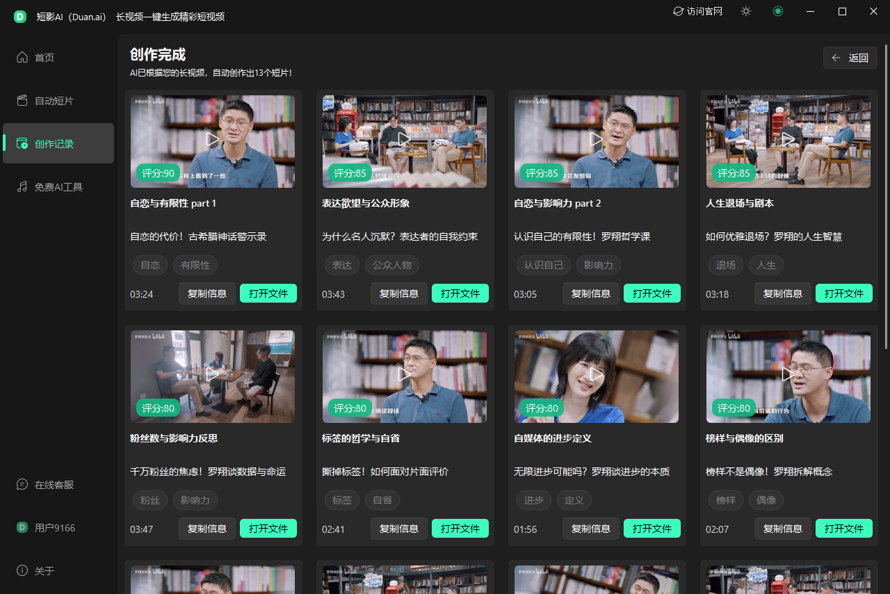 1 个长视频,一键自动生成 10 个爆款短片。剪辑创作速度提升 10 倍。